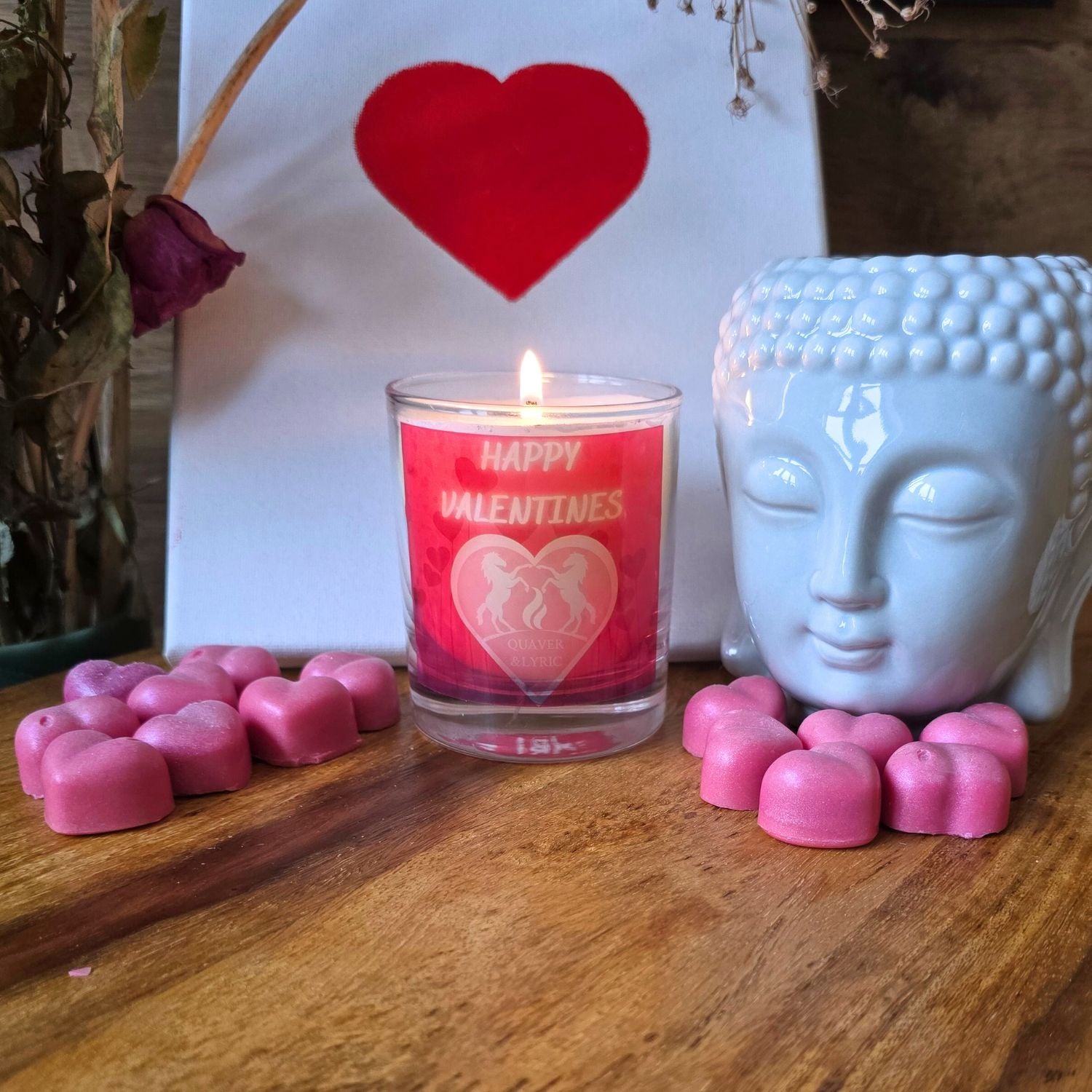 A beautifully scented Valentine candle with Quaver&Lyric heart design and the wording Happy Valentines. Handmade with love in Barton Seagrave, Northamptonshire using a high quality wax blend, the finest range of premium fragrances, hand-poured into quality glass containers and supplied in a kraft box.